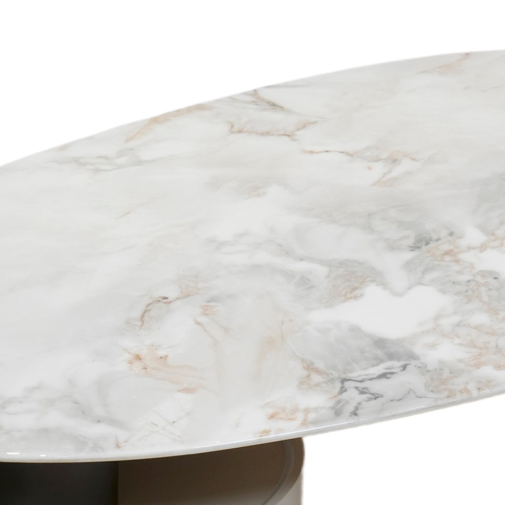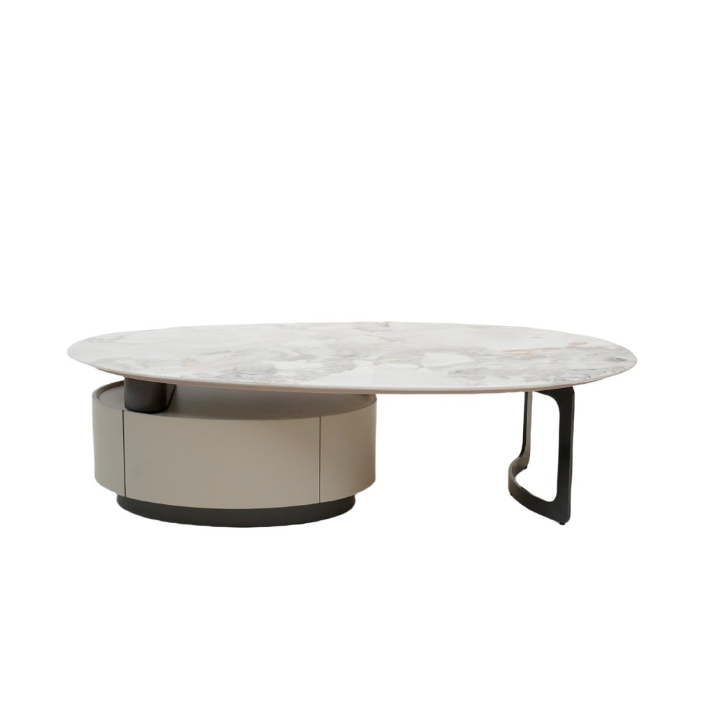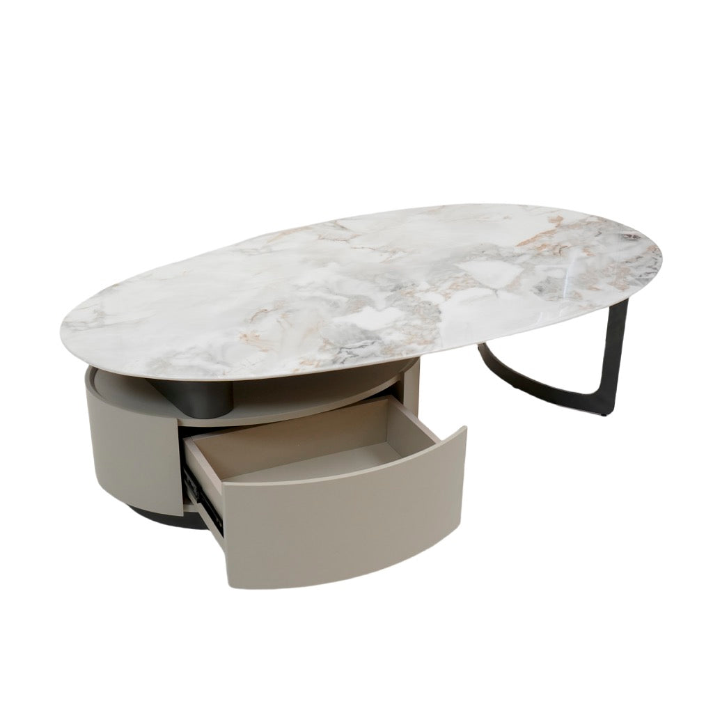 Mesita de Centro, Blanco con Marron y gris marmoleado + base Khaki y Gris oscuro. 140x75.5x38cm